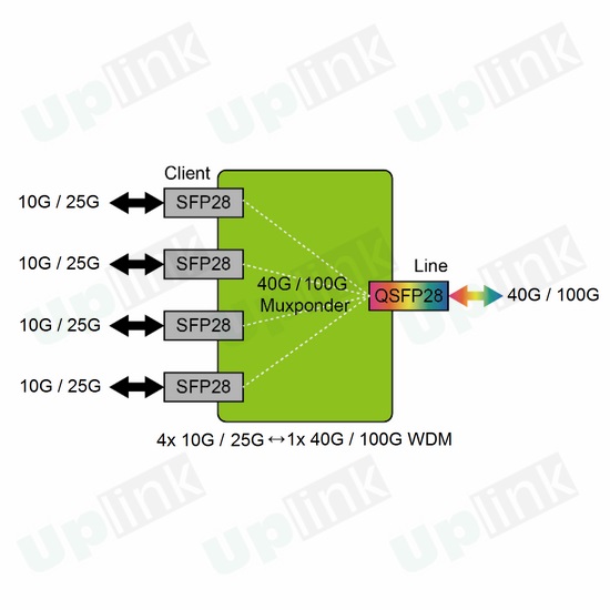 Функционал Мукспондер для организации и мультиплексирования до 4 дуплексных каналов со скоростью 10~25 Гбит/с в один канал со скоростью 40~100 Гбит/с по различным протоколам.